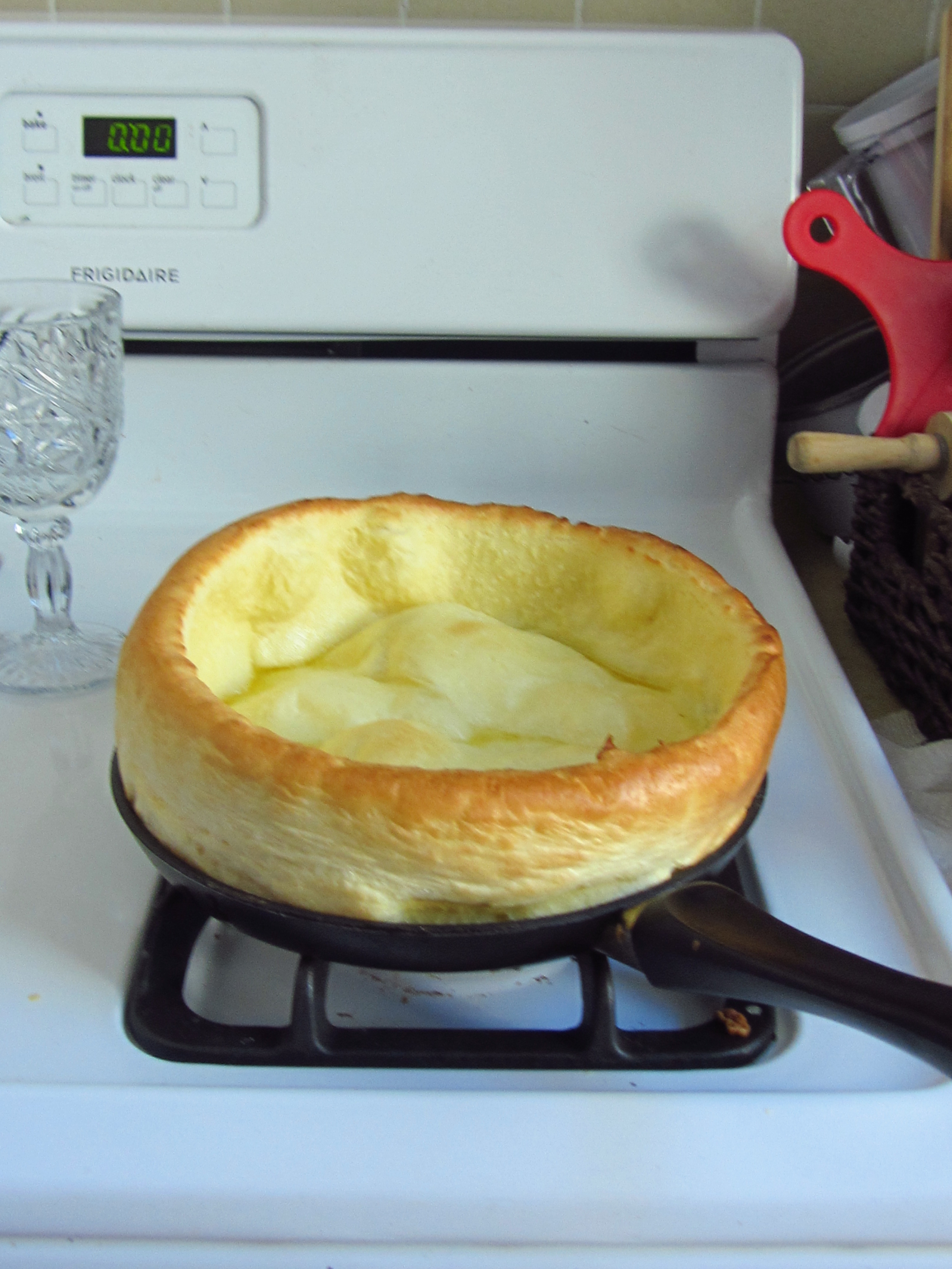 Roger’s recipe for Dutch baby pancakes: While skillet is preheating, combine 2 eggs, 1/2 cup milk, 1/2 cup sifted flour, lemon zest, a pinch of salt and 1 tsp vanilla extract. Remove preheated skillet from oven, and turn down heat to 425 degrees F. Melt 2 tablespoons of butter onto the skillet, and then puour your pancake batter into skillet. Remove when golden brown, as pictured.
