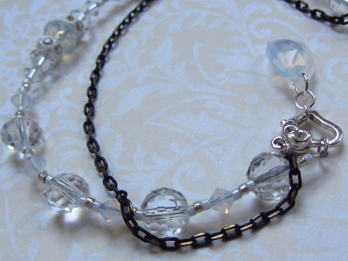 To create Bright Side of the Moon necklace: 10″ chain base strand (enamelled brass, black) + 8″ bold insert strand (white wedding) + white opal crystal pear drop charm (pendant corresponds with white wedding color theme) + hook-up clasp of your choice.