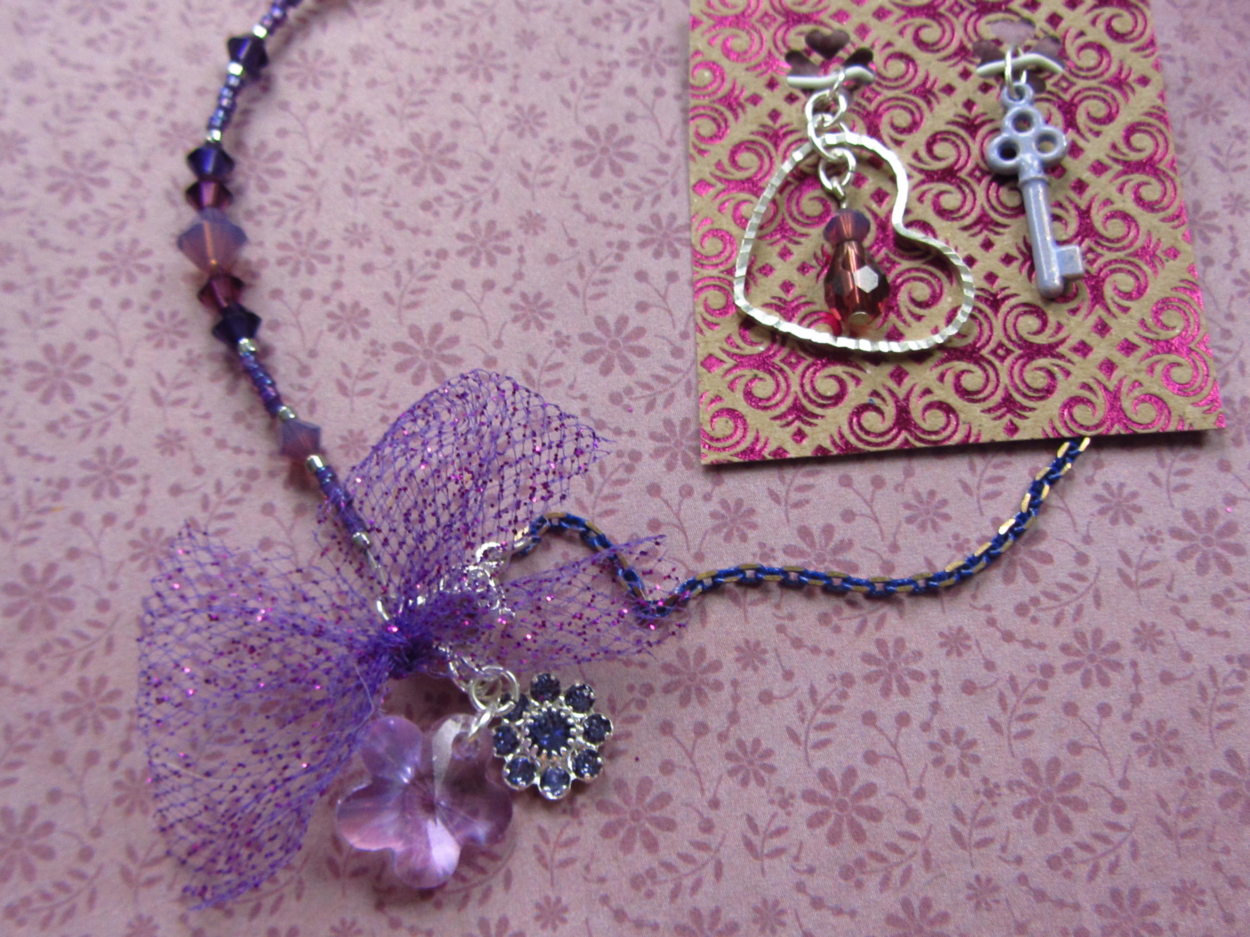 The mysterious nightshade plant, or bella donna, is a symbol of feminine beauty and mystery. To echo this idea, I included two flower charms (Swarovski crystal flower pendant in lilac; Swarovski crystal flower drop in tanzanite). Because her mother gave it to her as a gift, I wanted to include a heart to remind Emily of the love she shares with her family. The last charm is a custom purple key, to help Emily unlock her inner dreams and share them with the world as she grows.