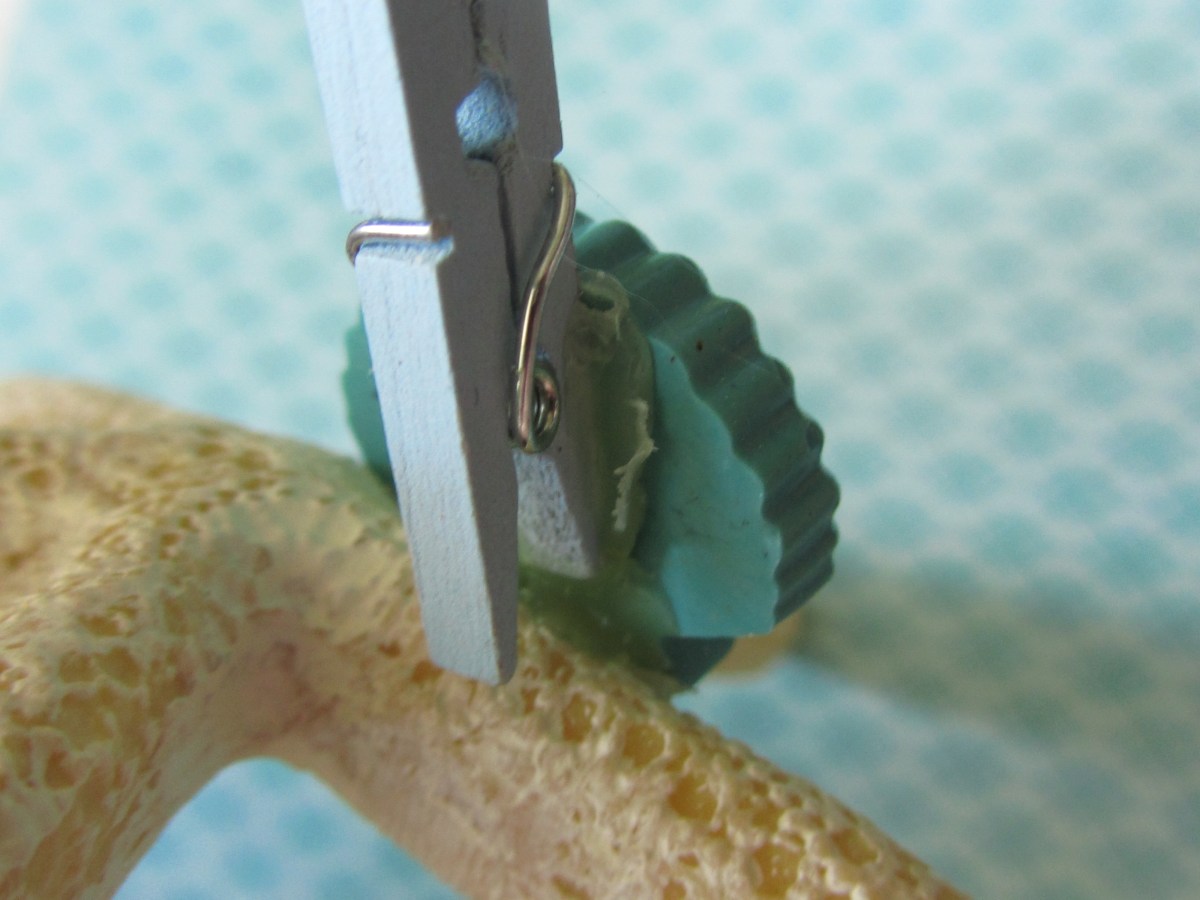 Step 5: Use glue gun to attach clothespin to decorative elements, or glue directly onto starfish base. Make sure you leave enough room to allow you to pinch the clothespin to attach the table number.