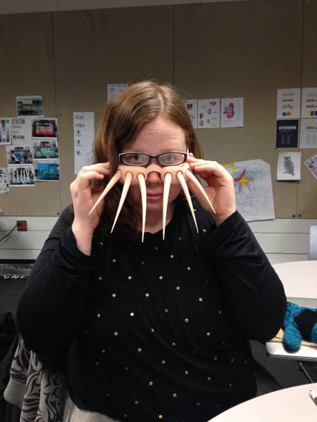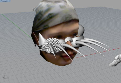 For the next iteration, I created the ‘exoskeleton’ that wraps around the face. In this instance, I overcompensated and gave the hairs way too much room and they barely touch the face. This was more of a test run as I wasn’t sure if I even had the right thickness of material, or how well it would fit the face (it fits me ok, others, not so much)- in the end I ran out of time. Learned a lot, though..