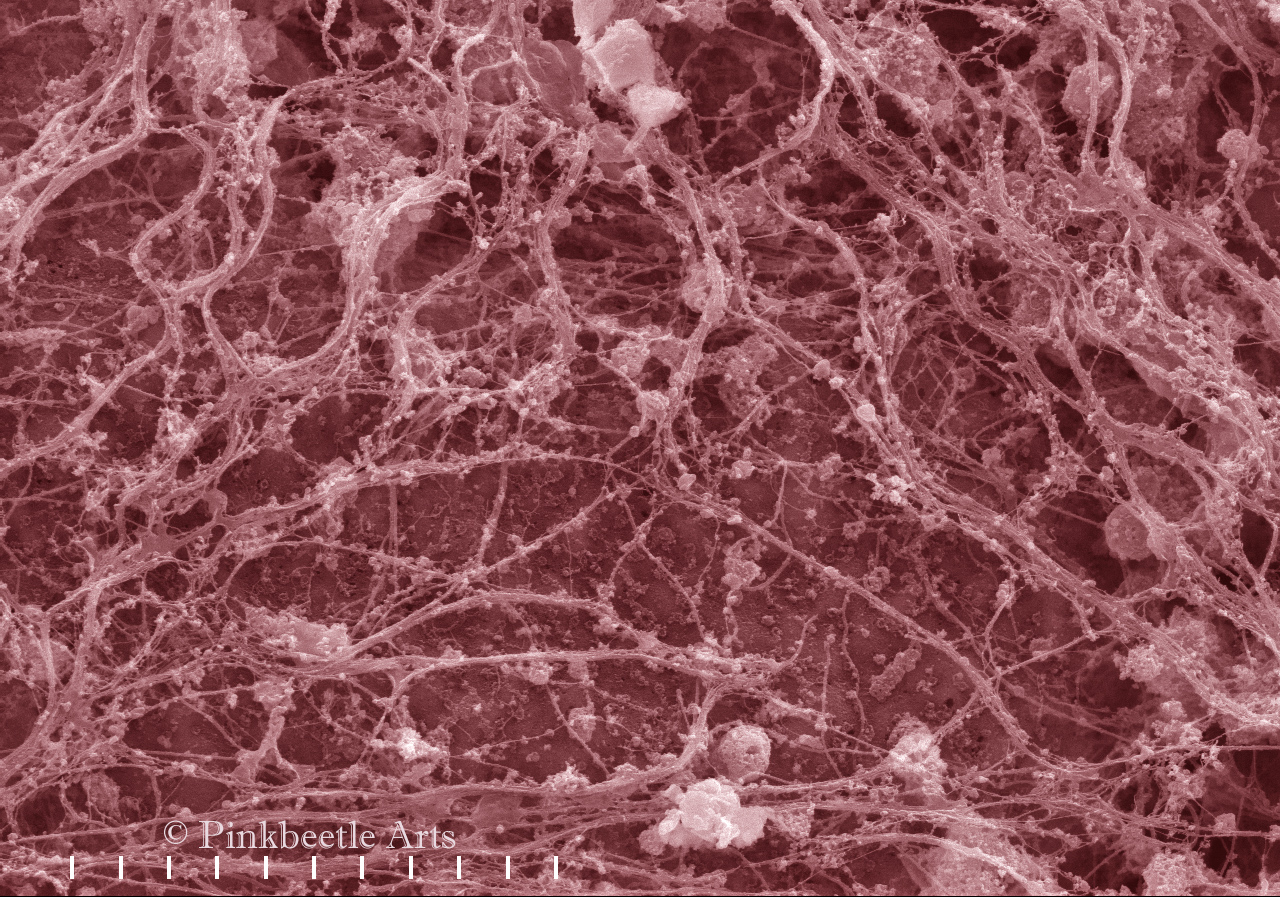 A veil comprised of bundles of cytoskeletal filaments lies atop the nucleus of a detergent-extracted CHO cell. While these fibers have a structural purpose, they are also vital to numerous reactions and cellular events- they continually form, dissolve, then reemerge- they are anything but static.